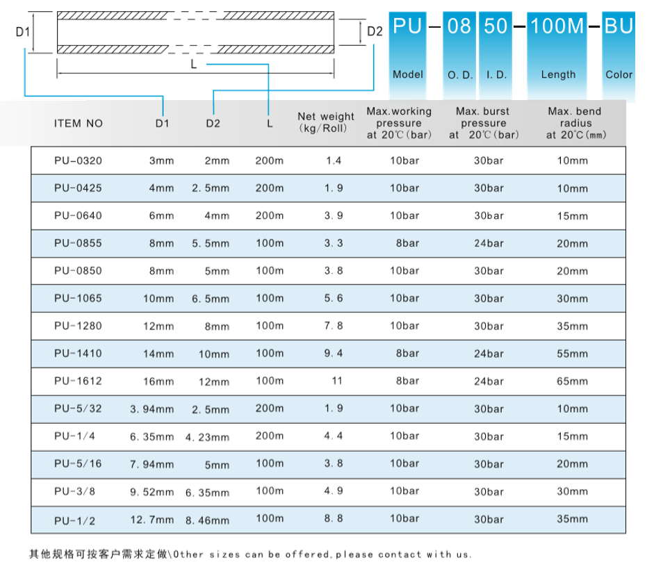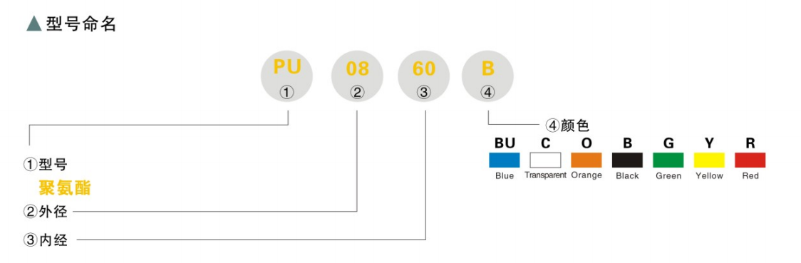 特点:具有良好的耐压,耐气候,耐腐蚀,耐曲折性能,用于气动管路的连接。